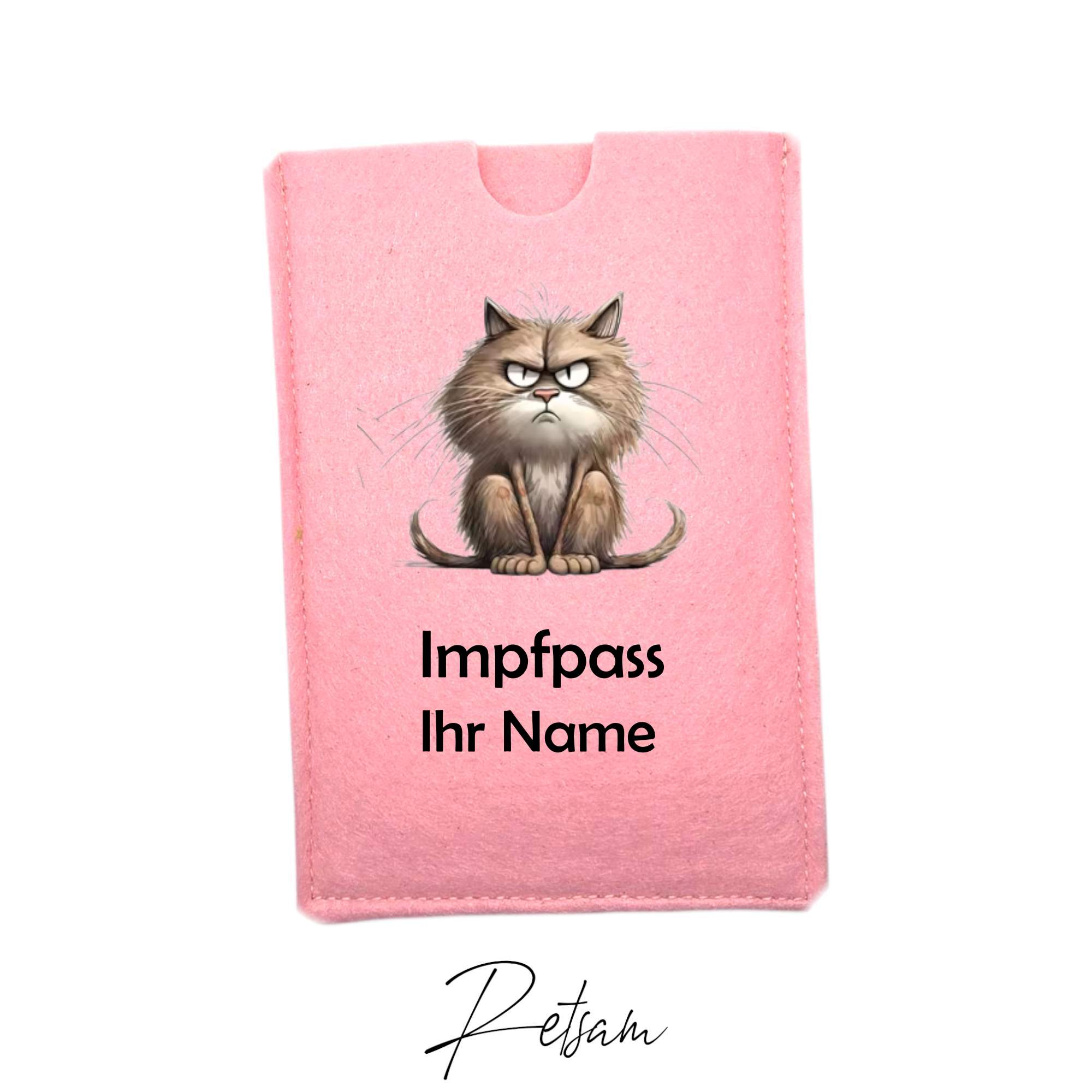 Besonderes Highlight ist die Illustration einer wunderschönen Katze auf der Vorderseite – ein echter Hingucker, der garantiert für Schmunzeln sorgt. Darunter steht der Schriftzug „Impfpass“ in eleganter Schrift.