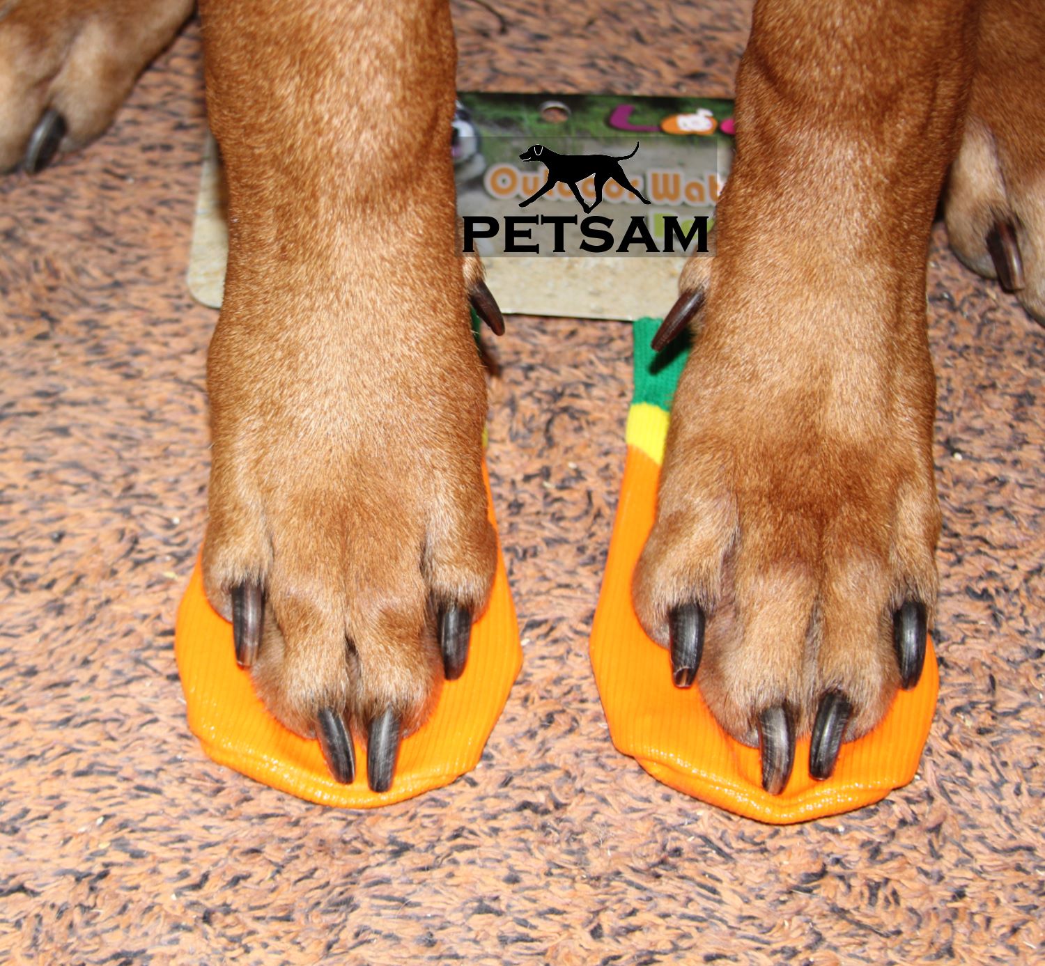hier der gleiche Hund mit den Socken. Die schwarzen Streifen sind die Klettverschlüsse.